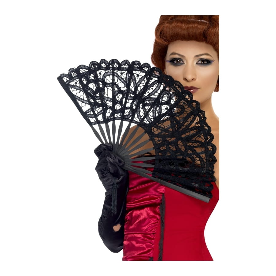 Eventail gothique pour femme. Ce magnifique accessoire est en dentelle de couleur noire, avec de jolis motifs. Vous pourrez l'associer à un déguisement de cabaret, de marquise ou de danseuse burlesque.
