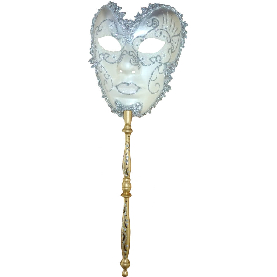 Un face à main vénitien luxueux de couleur blanc avec des paillettes et des strass, avec un bâton de couleur doré et argenté pour le tenir dans la main. Ce face à main couvre parfaitement le visage, tout le monde se demandera qui se cache derrière ce masque. Vous pourrez vous en servir pour une fête basée sur Venise ou le romantisme.