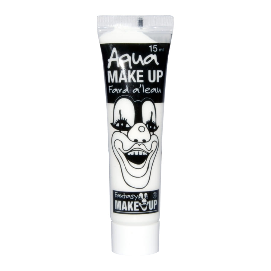 Tube de fard à l'eau de couleur blanche, de la marque Aquacolor. Ce tube contient 15 millilitres de maquillage et vous permettra de peindre environ 10 visages. Vous pouvez l'appliquer directement sur la peau, en utilisant un pinceau pour plus de précision et en superposant les couleurs si vous le souhaitez. Pour l'enlever, il suffit d'un peu d'eau et de savon. Ce maquillage est parfait pour créer un visage de clown.