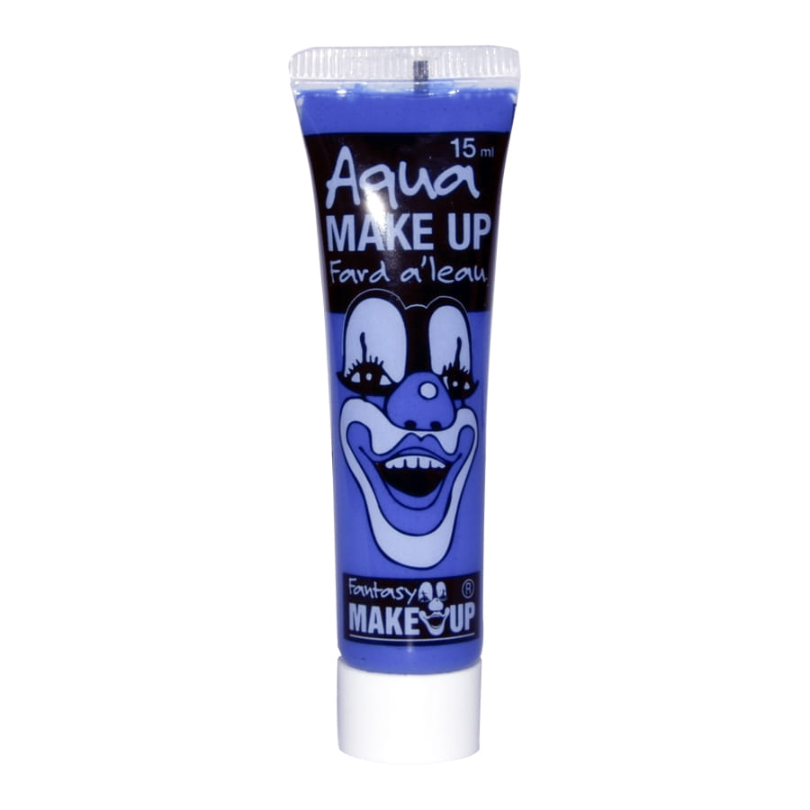 Tube de fard à l'eau de couleur bleu, de la marque Aquacolor. Ce tube contient 15 millilitres de maquillage et vous permettra de peindre environ une dizaine de visages. Vous pouvez l'appliquer directement sur la peau, en utilisant un pinceau pour plus de précision et en superposant les couleurs si vous le souhaitez. Pour l'enlever, il suffit d'un peu d'eau et de savon. Avec ce maquillage, vous compléterez avec aisance votre déguisement d'Halloween.