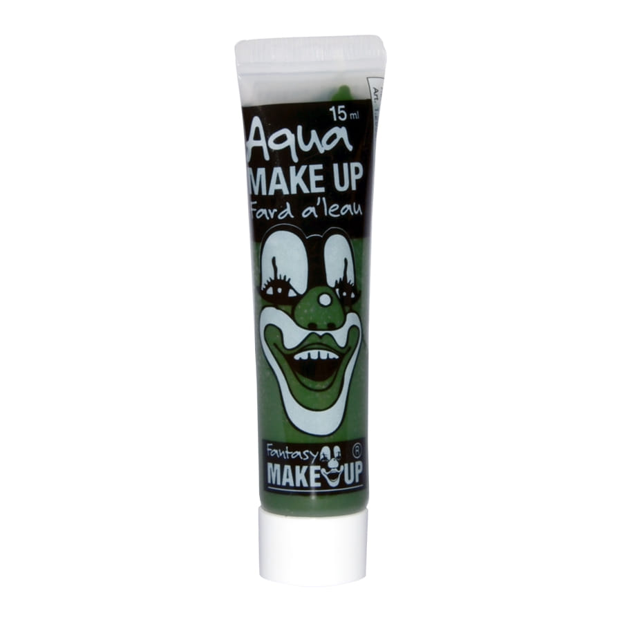 Tube de fard à l'eau de couleur verte, de la marque Aquacolor. Ce fard est idéal pour un maquillage de cirque ou d'Halloween. Ce tube contient 15 millilitres de maquillage, vous permettant de peindre environ 10 visages. Vous pouvez l'appliquer à même la peau en utilisant un pinceau pour un résultat plus précis ou superposer les couleurs. Pour l'enlever, il suffit d'un peu d'eau et de savon.