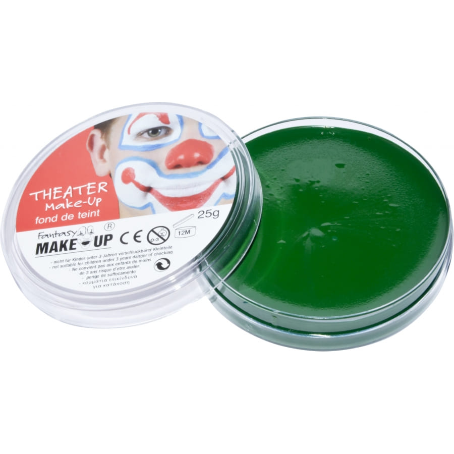 Fard gras de couleur verte. Ce pot contient 25 grammes de maquillage hypoallergénique. Ce fard s'applique à la main ou avec une éponge. Il peut donner un aspect transparent ou opaque et s'enlève avec de l'eau et du savon ou avec du démaquillant. Pour une meilleure tenue, servez-vous du fixateur pour fard gras. Ce maquillage est parfait pour un déguisement de Saint Patrick ou pour un carnaval.