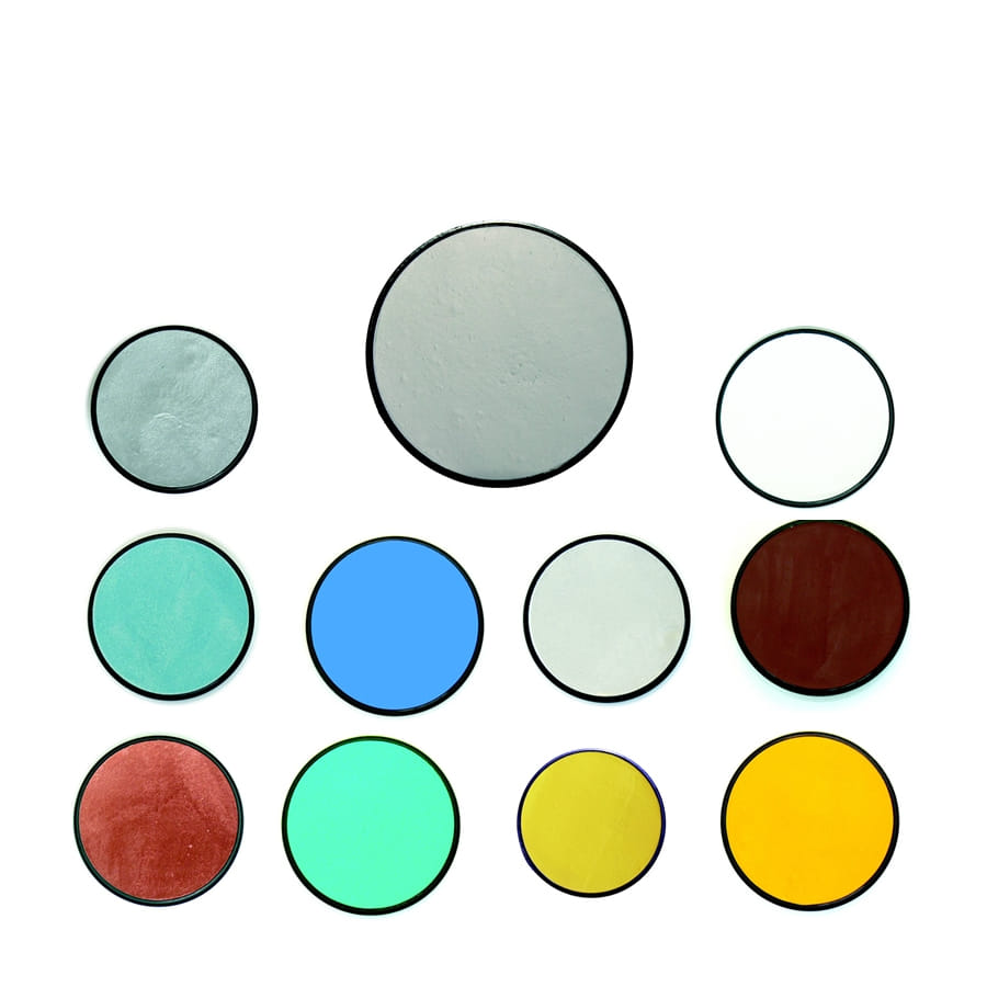 Les autres couleurs sont proposées dans un contenant de 20 ml : argent, blanc nacré, bleu, bleu nacré, bleu lagon, cuivre métallique, gris, jaune, jaune soleil, marron, or métallique, orange, rose, rouge, vert clair, vert, violet et terracotta.