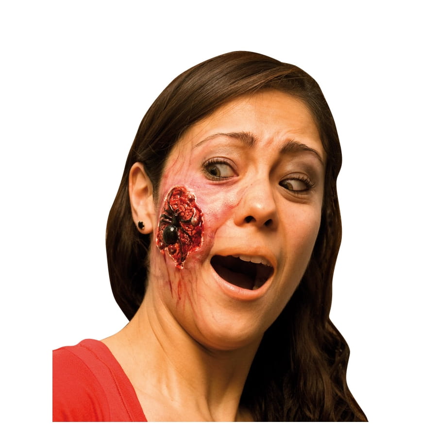 Il s'agit d'une trompe oeil très réaliste qui représente un nid d'araignée sous forme de plaie ouverte. Une araignée s'y trouve comme si elle avait dévoré votre joue. C'est une fausse blessure conçue pour maquiller votre visage pour Halloween. Elle sera idéale pour compléter votre déguisement araignée.