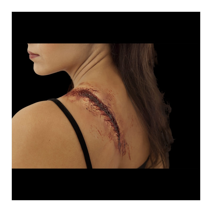 Soyez à la fois terrifiant et original avec cette fausse cicatrice plus vraie que nature, dédiée aux adultes. Elle est faite en latex, de couleur rouge, et donnera l'impression d'une entaille profonde, sanguinolente et recousue. Pour sa mise en place, il faut d'abord que vous choisissiez l'emplacement. Après, mettez de la colle sur la prothèse et/ou sur la peau, puis tamponnez à l'aide de vos doigts ou d'une éponge maquillage. Appliquez du latex liquide sur les bords et rajoutez un peu de faux sang ou un peu de maquillage à crème si vous voulez (maquillage et faux sang non compris). Et voilà, des effets spéciaux spectaculaires qui ne manqueront pas de faire sensation lors de la fête d'Halloween ou le temps d'une soirée à thème Horreur.
