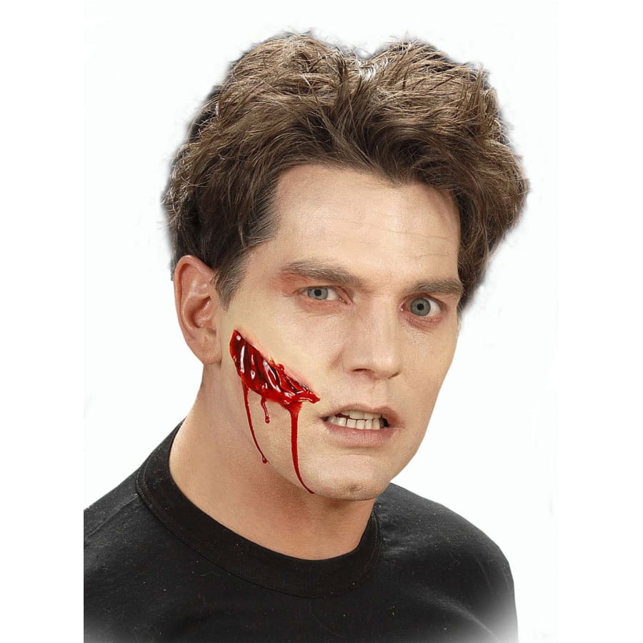 Le kit se compose d'une fausse plaie béante de 8,5 cm de long accompagnée de 2 sachets de colle d'une contenance de 1,5 ml.