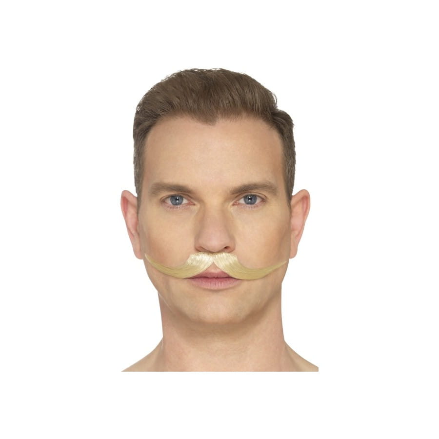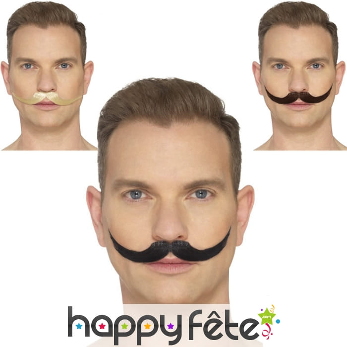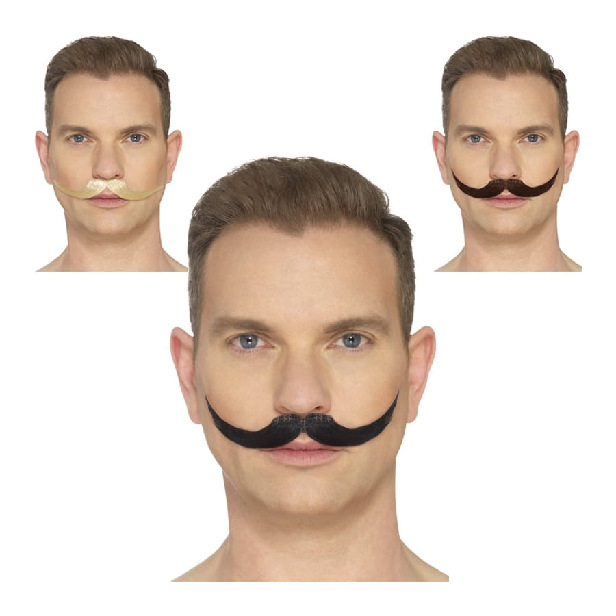 • Fausse moustache anglaise adhésive. Proposée en Blond, noir ou brun.