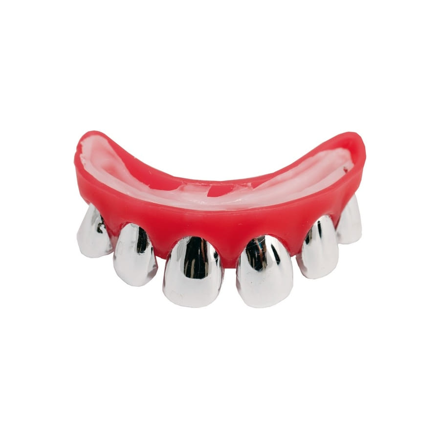 Incarnez parfaitement un rappeur américain en complétant votre déguisement avec ces fausses dents argentées que nous vous proposons.