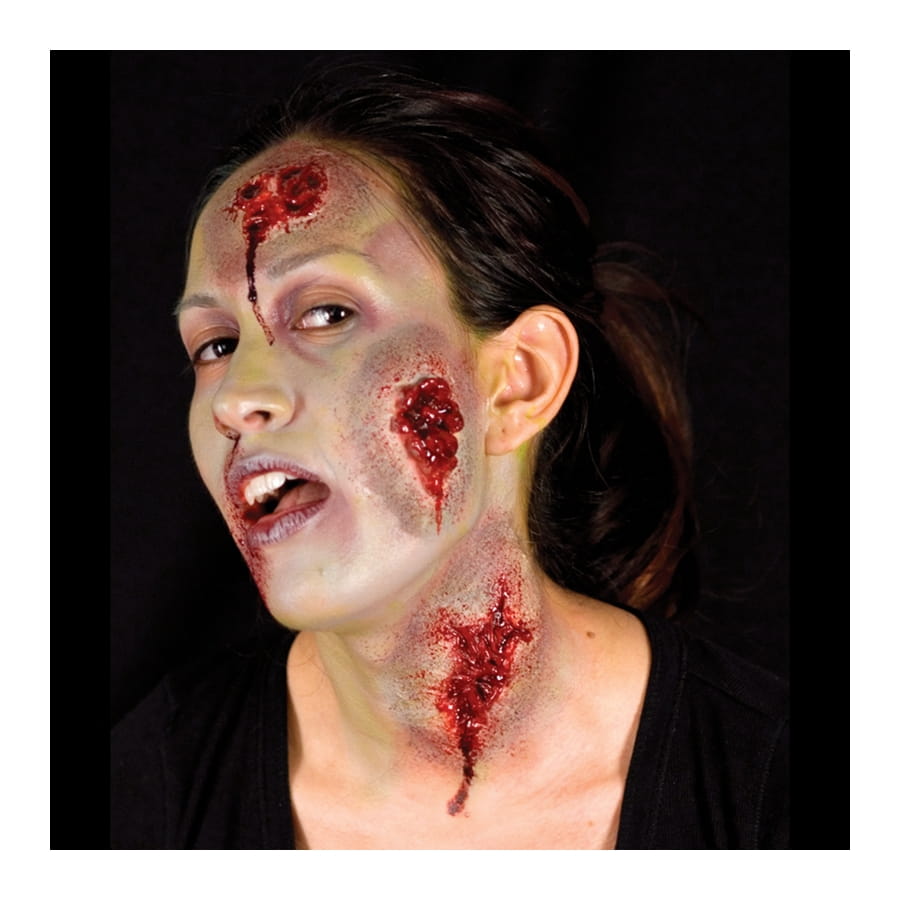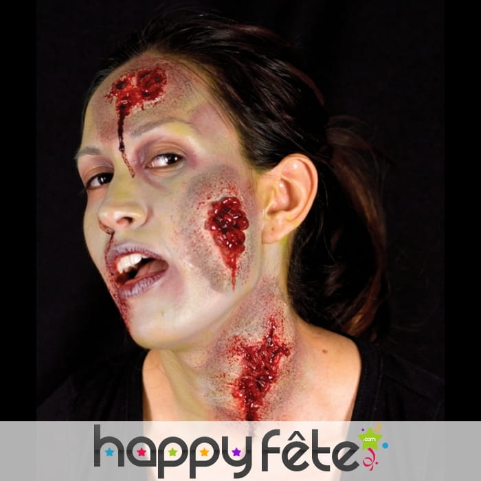 Voici un effet spécial qui créera à coup sûr beaucoup de panique et de dégoût. Il simulera de très grosses plaies béantes et suintantes. Ces fausses plaies sont de couleur rouge, livrées seules, sans maquillages. Avant de les mettre en place, choisissez d'abord l'endroit où vous voulez l'appliquer : sur le visage, le cou, les mains, etc..., puis mettez de la colle sur la peau et/ou sur la prothèse et tamponnez à l'aide de vos doigts ou d'une éponge à maquillage. Appliquez du latex liquide sur les bords pour une fixation favorable et pour mieux cacher ces bords. Il va de soi que le faux sang et le maquillage sont de mise pour perfectionner l'effet. Découvrez toutes nos panoplies de produits cosmétiques dans cette section, vous y trouverez tout ce qu'il vous faut pour obtenir le meilleur déguisement d'Halloween.