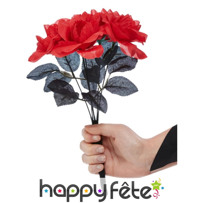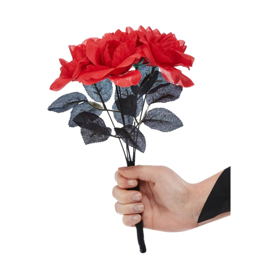 Compléter une tenue de mariée zombie lors d'une nuit d'Halloween pleine de frissons, avec le faux bouquet de fleurs rouge et noir.