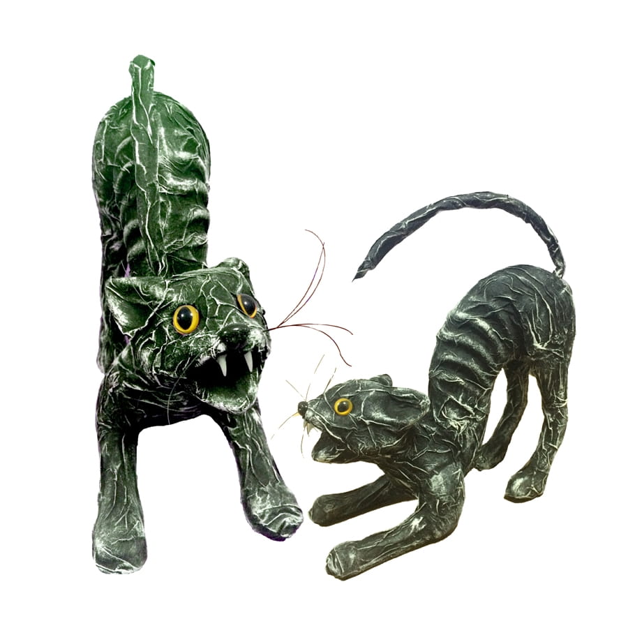 Voici un faux chat momifié et monstrueux, mesurant 30 cm. Il a été confectionné en polystyrène à 70%, en papier à 28% et en plastique à 2%, à poser quelque part dans votre salle de fête. Quoi de plus effrayant pour Halloween et toute fête basée sur le thème de l'épouvante ou de l'Égypte ? Effet gore garanti !