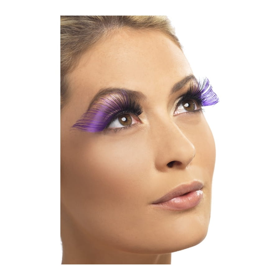 Paire de faux cils ultra longs, de couleur violette et noire, pour femme ou adolescente. Les faux cils sont noirs à la base et deviennent graduellement violets vers les extrémités. Ce modèle de faux cils est particulièrement long, ce qui les rend idéaux pour un déguisement de cabaret, pour un regard très féminin.