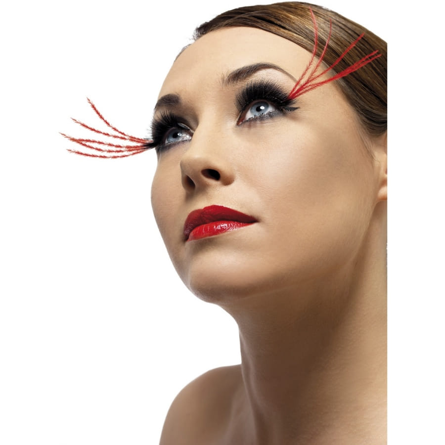 Avec ces faux cils vous captiverez tout le monde. Pour une fête ayant pour thème le cabaret ces faux cils de couleur noir avec de très longues plumes rouges sur le coté sont idéals. Commencez par les coller par le centre et rabattez les sur les cotés. De couleur noir avec des longues plumes rouges sur le coté. Ils sont vendus avec colle.