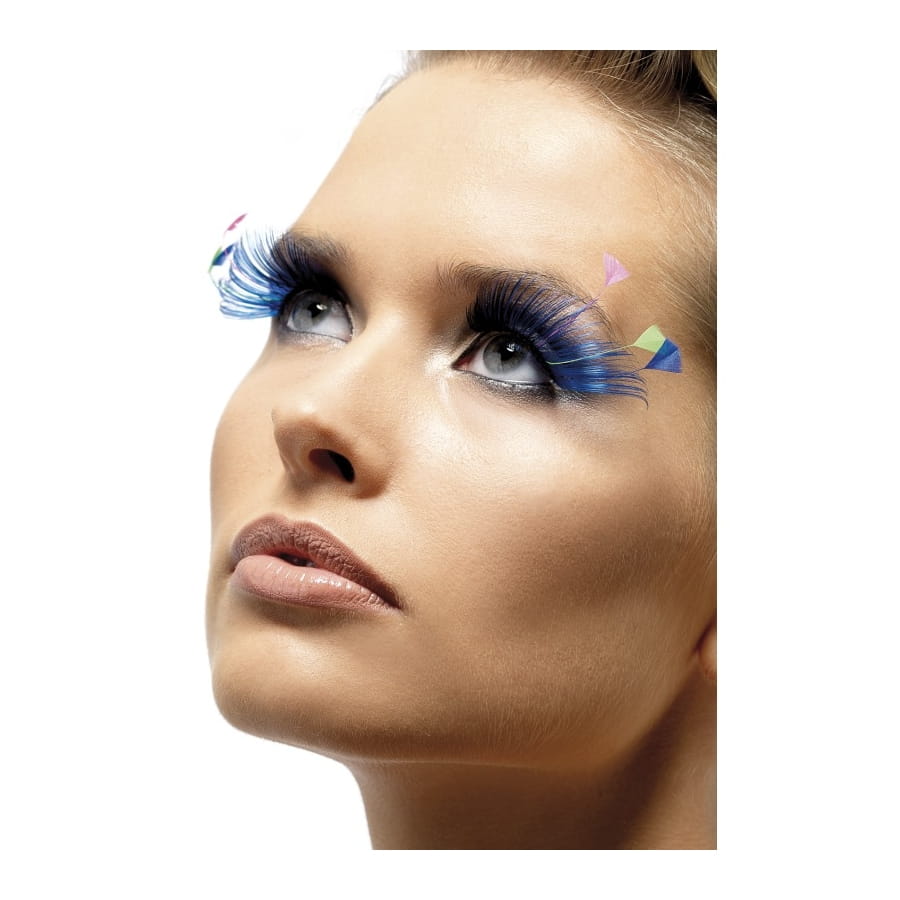 Paire de longs faux cils à plumes de couleur bleue, pour femme ou adolescente. Outre leur longueur particulière, les cils sont également ornés de petites plumes, les rendant idéaux pour un déguisement de carnaval ou pour une tenue excentrique.