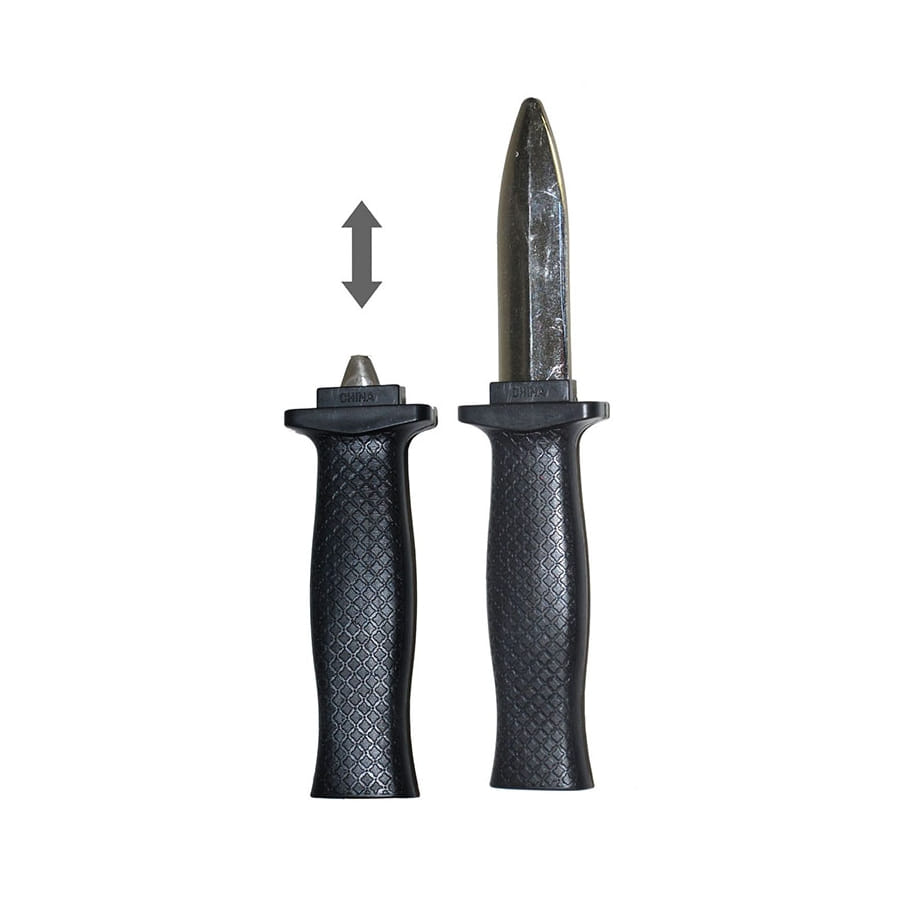 Il s'agit d'un faux couteau noir dont la lame se rétractera automatiquement en faisant pression dessus.