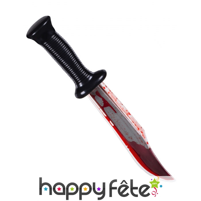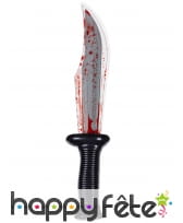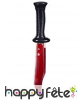 Il possède un manche noir et une lame grise recouverte de sang factice.