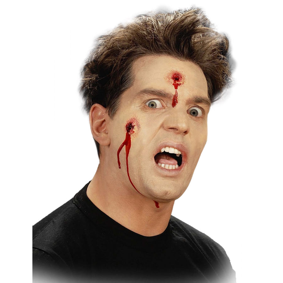 Ce set de deux impacts de balle de couleur beige et rouge. Cette fausse peau est ronde et au centre semble être un creux cela donne l'effet de deux impacts de balle. Il est vendu sans colle. Vous pouvez la coller avec de la colle à postiche.
