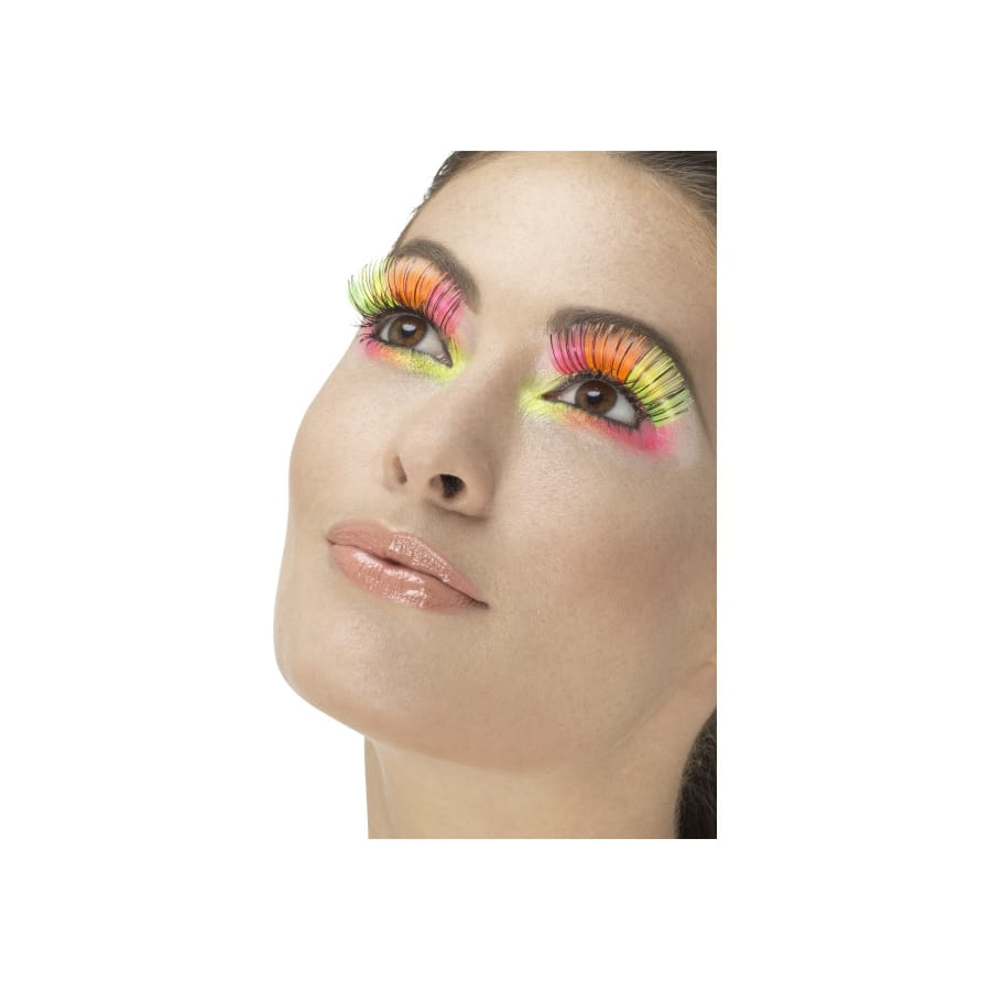 Uniquement pour la gent féminine, cette paire de faux longs cils multicolores fluo, années 80 mettra une jolie touche colorée à votre costume pour une fête à thème Paillettes ou un carnaval. Ces superbes faux cils multicolores à longs poils illumineront votre regard de rose, de jaune et d'orange. La colle fixatrice vous est fournie pour une pose facile.
