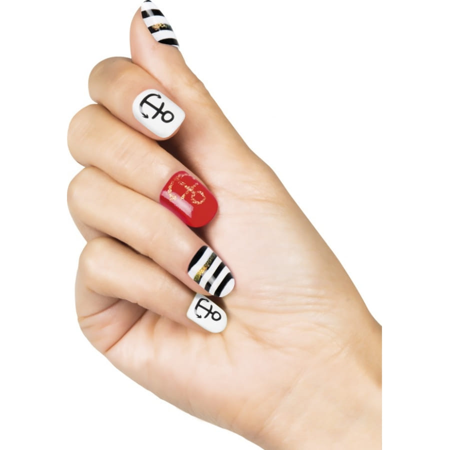 Il s'agit d'un ensemble de 24 faux ongles repartis de façon très précise: 14 de ces faux ongles sont à rayures blanches et noires avec une fine couche de paillettes, 4 sont rouges avec une ancre pailletée et 6 sont blancs et décorés d'une ancre noire.