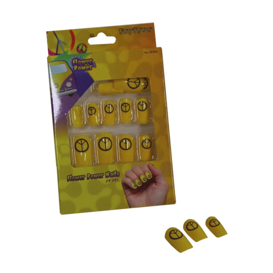 Peaufiner votre look de hippie avec les faux ongles peace and love sur fond jaune.