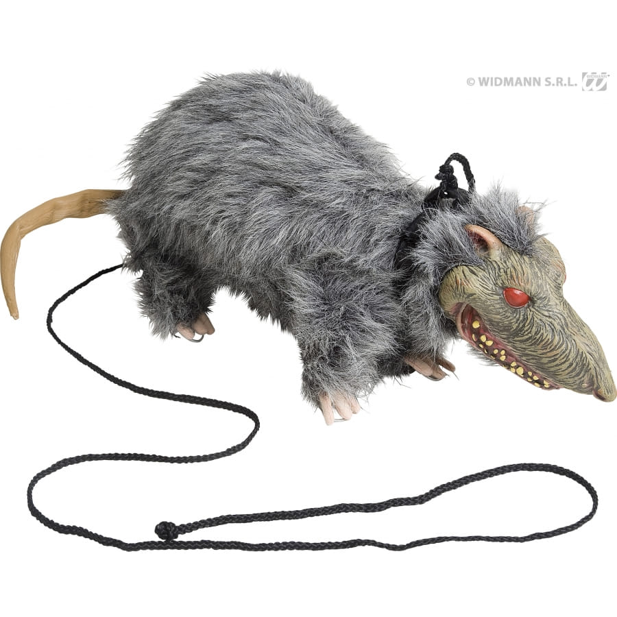 Faux rat effrayant, en laisse, de couleur noire et grise avec yeux rouges. Cet accessoire mesure 68 centimètres de long. Avec cet animal de compagnie atypique, vous attirerez le regard de votre entourage à coup sûr!