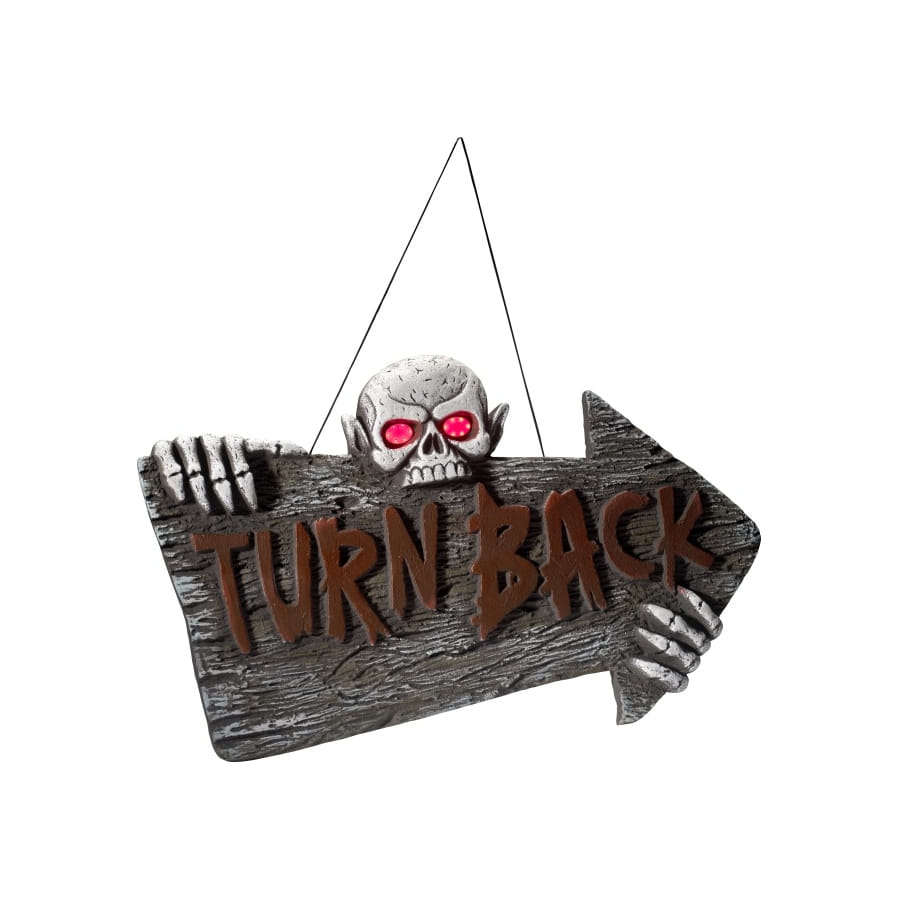 La flèche indicative Turn Back avec yeux lumineux correspond à un article de décoration pour accueillir la fête des morts. Elle représente une inscription disant « Turn Back » qui signifie littéralement « Faites demi-tour ». Celle-ci est gravée dans une flèche en faux bois de couleur grise. Cette indication se trouve entre des mains d'un squelette, avec la tête présentant des yeux rouge qui s'allument grâce à la batterie incluse.