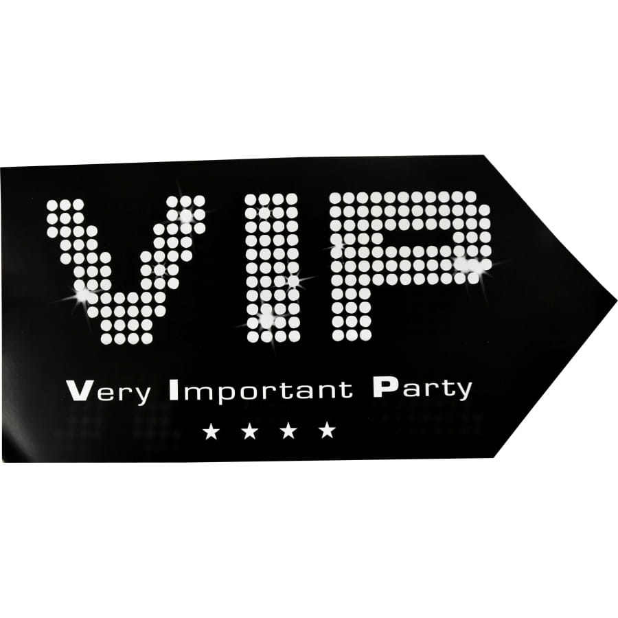 Pour une fête ayant pour thème le cinéma, jet set, ou cinéma, avec cet accessoire de fête, vos invités ne se perdront pas . De couleur noir avec comme inscription dessus VIP avec des petites étoiles en dessus. Vous pourrez aussi utiliser cette flèche VIP (very important party) a d'autres occasions comme une fête bling bling.