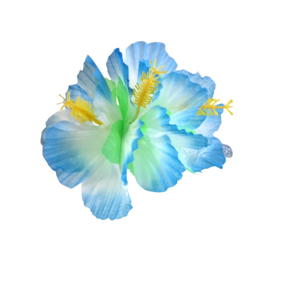 C'est une barrette en plastique transparent, sur laquelle est fixée une fleur d'hibiscus en tissu bleu ciel.