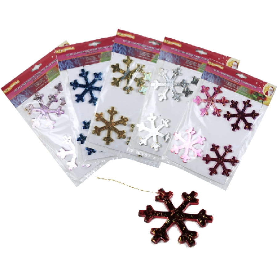 Lot de 4 suspensions en forme de flocons mesurant chacune 7 centimètres. Il existe 6 couleurs de suspensions possibles: argent, bleu, doré, blanc, rose et rouge. Il vous sera, cependant, impossible de choisir ni la couleur ni le modèle des suspensions. Vous recevrez une de celles présentées. Réalisez une décoration de Noël unique.