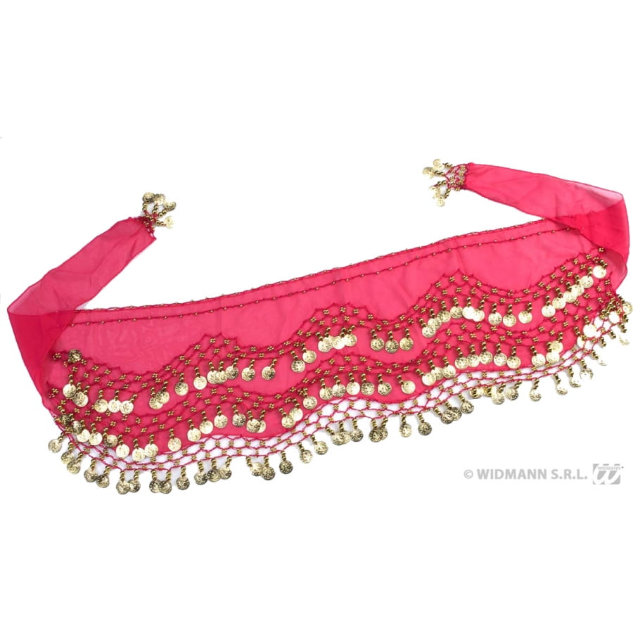 Foulard oriental rose et agrémenté de décorations dorées. Cet accessoire est indispensable pour une soirée mille et une nuits.