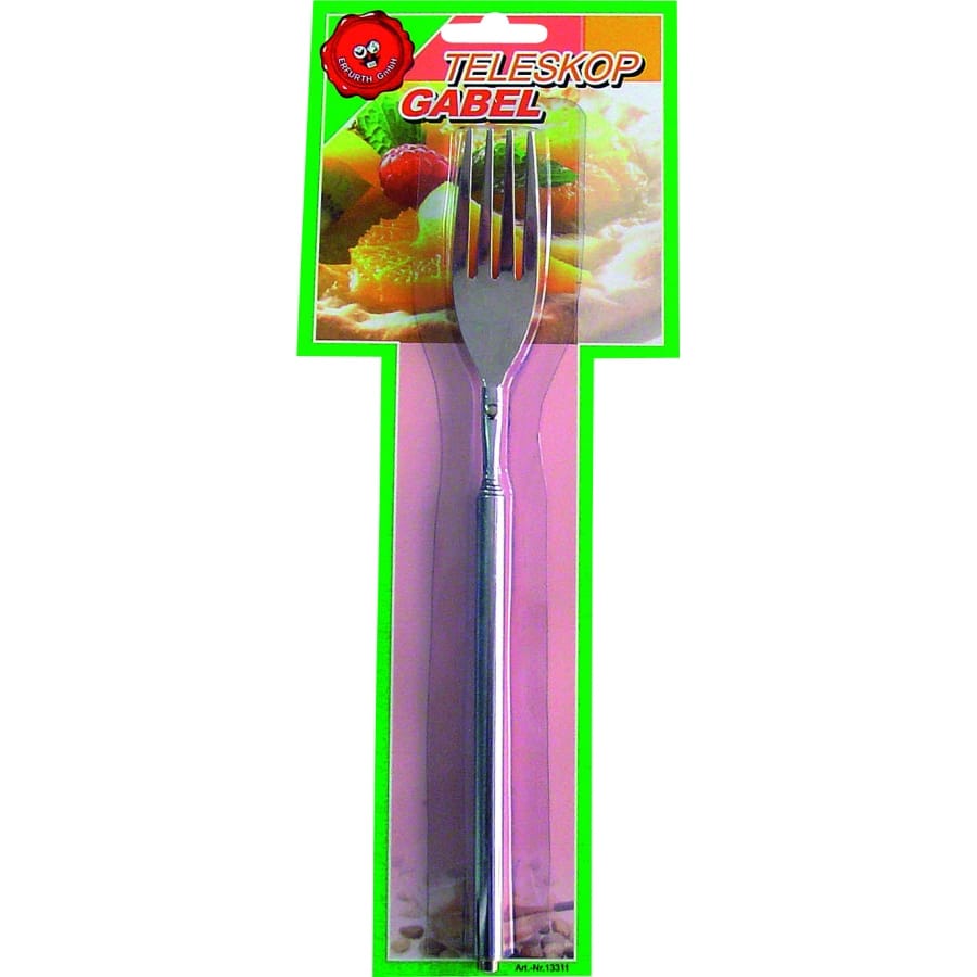 Pour faire une farce pour le 1er Avril, cette fourchette télescopique vous sera utile. Argenté avec quatre pique , cette fourchette fait 23 centimètre replié et 63 centimètre déplié Vous pourrez aussi vous en servir pour faire une farce à un anniversaire.