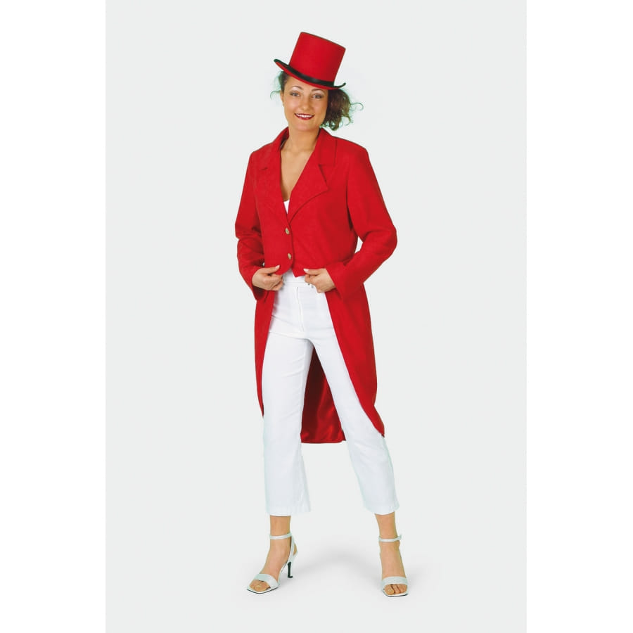 Apportez une touche d'originalité à votre garde-robe en vous procurant un vêtement pas comme les autres ! Ce frac gabardine rouge pour femme, effet velours est idéal pour animer un goûter d'anniversaire à travers un petit numéro de cirque. Il est bien long à l'arrière tandis qu'il présente une ouverture sur le devant.