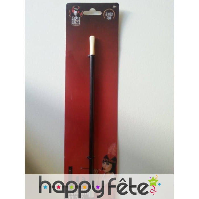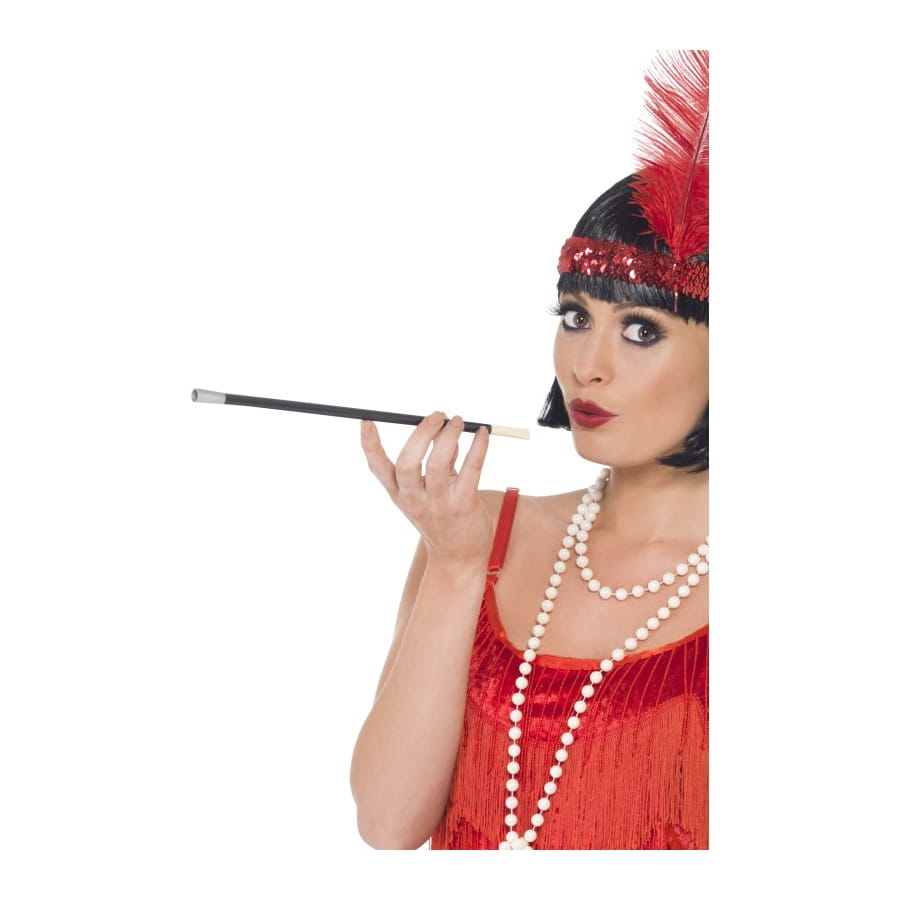 Fume-cigarettes noir avec perles argentées et embout beige. La taille de cet accessoire est de 30 centimètres. Il est idéal pour une soirée cabaret ou pour une fête basée sur le thème des années 20-30.