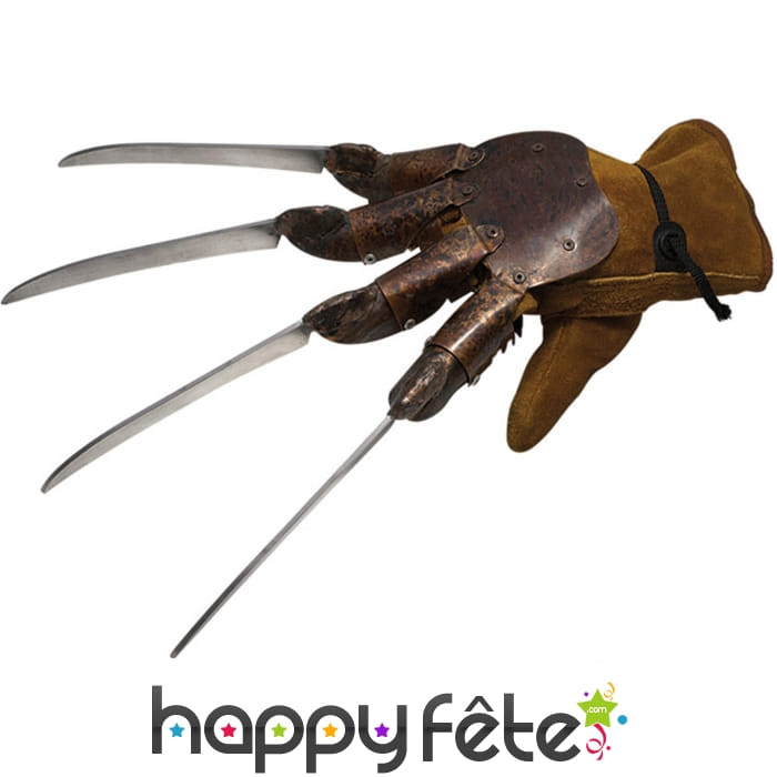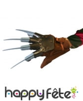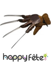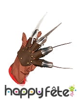 Complétez votre costume par un accessoire sous licence officielle Freddy Krueger&trade si vous avez choisi ce déguisement pour la fête des morts. Pour ce faire, nous avons un article unisexe répondant à ces critères. Il s'agit du gant de Freddy Krueger officiel. Il se compose d'un tissu marron qui se referme au niveau de la paume de la main. Au bout de chaque doigt se trouvent des lames en plastique, imitation métal.