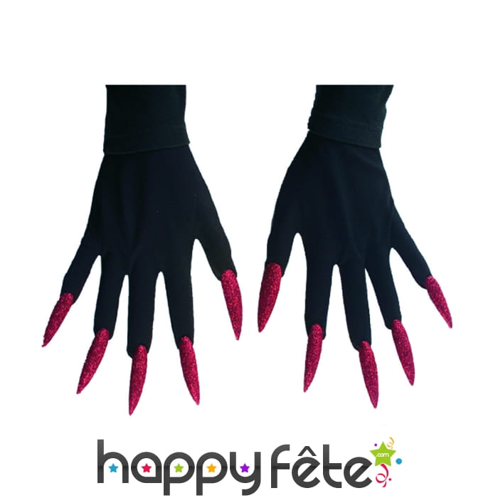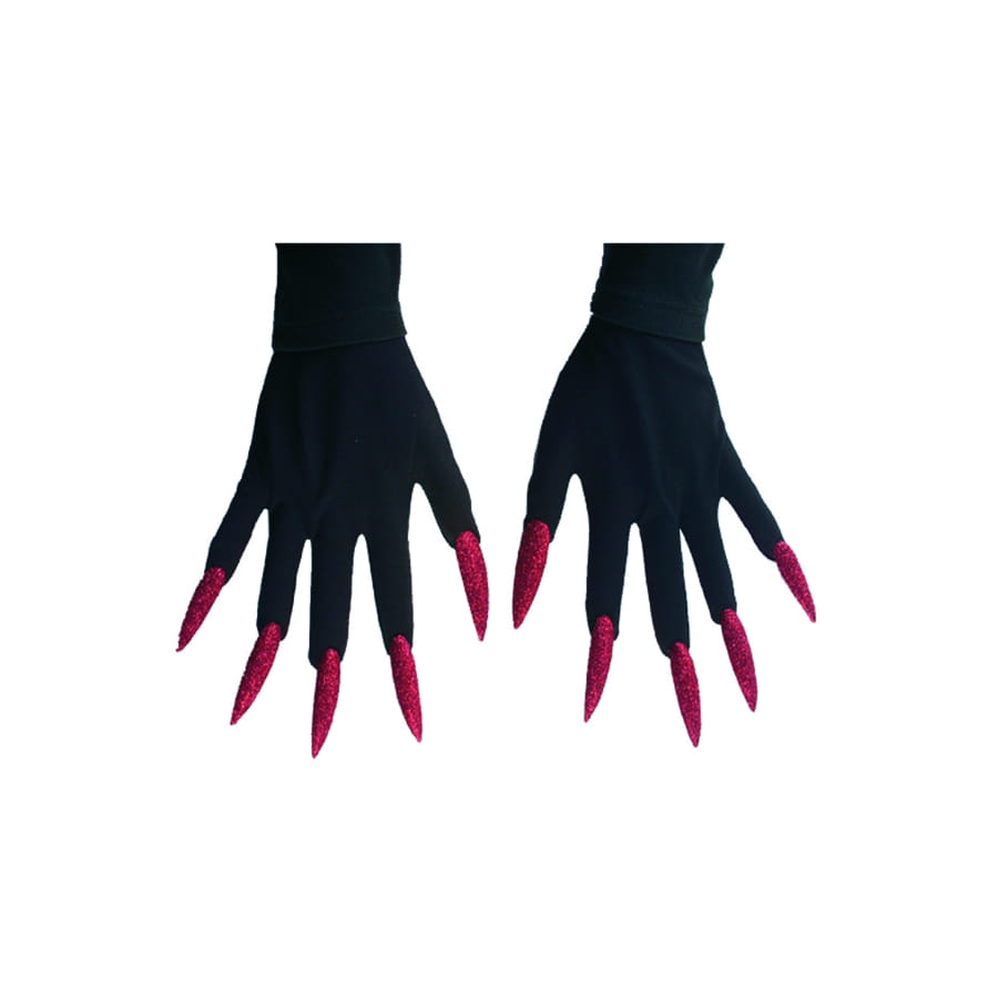 Paire de gants de monstre de couleur noire avec longs ongles de couleur rouge maxi pailletée. Portez ces gants avec votre tenue de vampire ou de sorcière pour la rendre plus crédible.