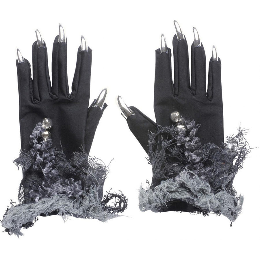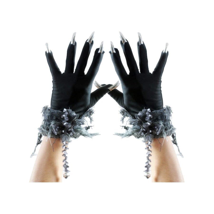 Paire de gants de couleur noire avec grelot, tissu et ongles en argent, pour femme. Ces gants vous donneront un aspect méchant, convenant très bien à un déguisement de sorcière ou de vampire.