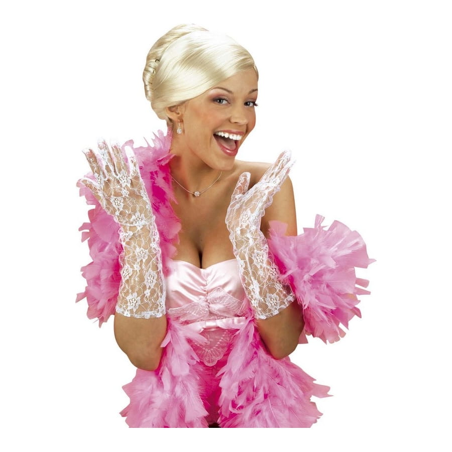 Paire de gants blancs en dentelles pour femme. Les gants mesurent 40 centimètres de long. Cet accessoire est parfait pour une tenue de danseuse ou de princesse.