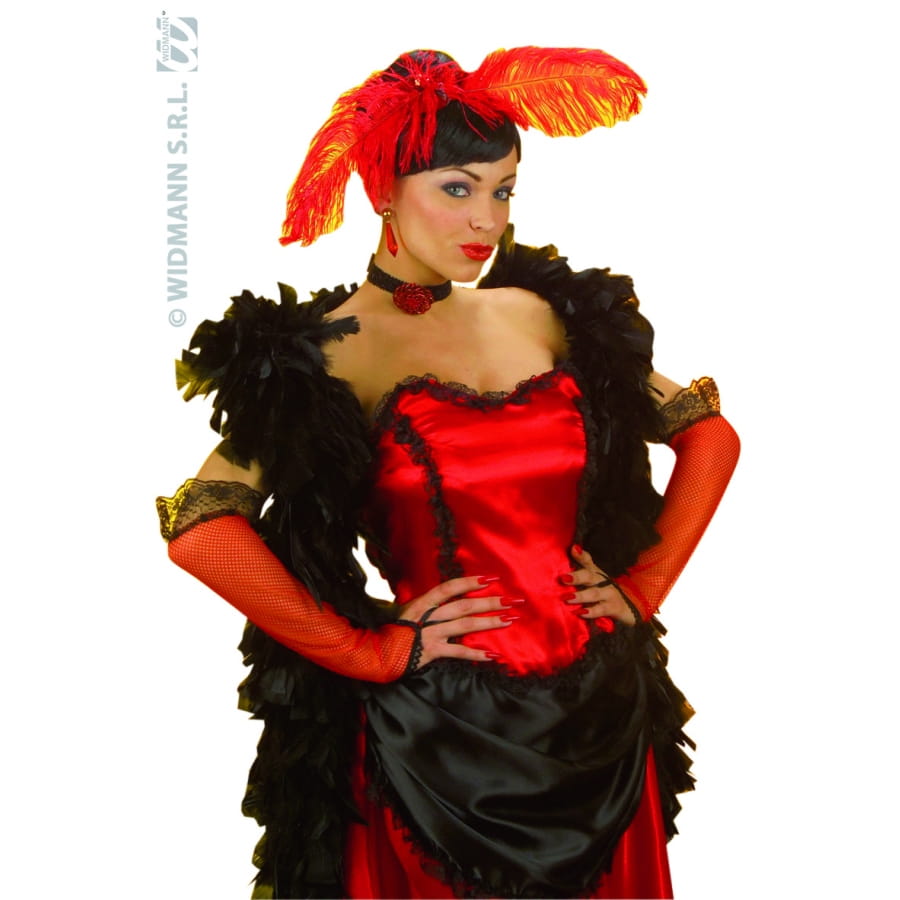 Paire de gants en résille de couleur rouge. Les gants font 33 centimètres de long et sont disponibles en taille unique. Cet accessoire convient très bien à un déguisement de danseuse western.