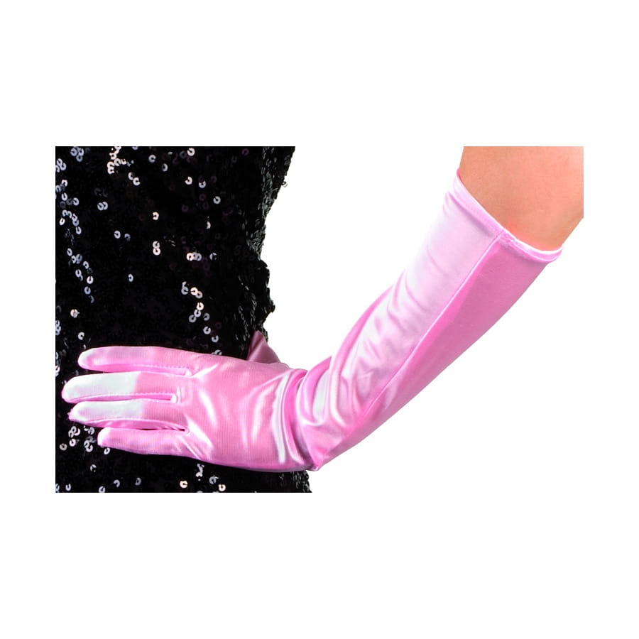Paire de gants de princesse ou de magicienne satinés de couleur rose et en élastique. Les gants sont de 40 centimètres de long. Vous pouvez les utiliser pour un déguisement de conte de fée mais aussi pour compléter un déguisement de Drag Queen.