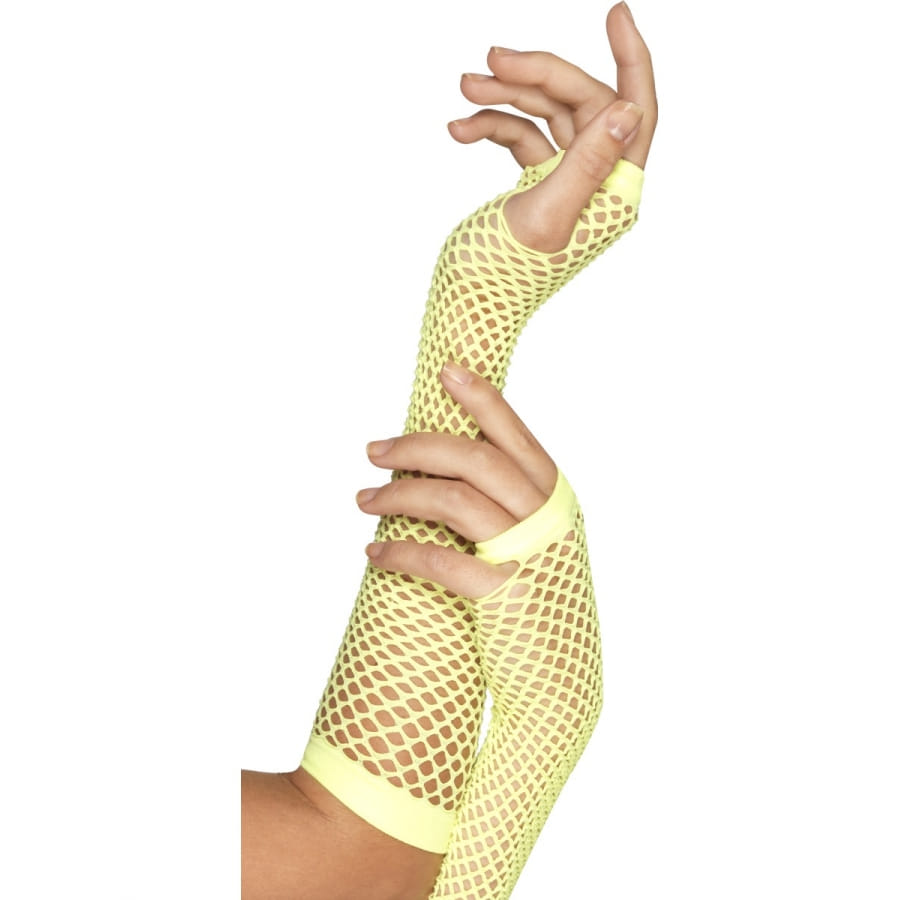Paire de gants funky jaunes entièrement en filet. Les gants sont un accessoire parfait pour compléter une tenue de danseuse disco pour une fête riche en paillettes.