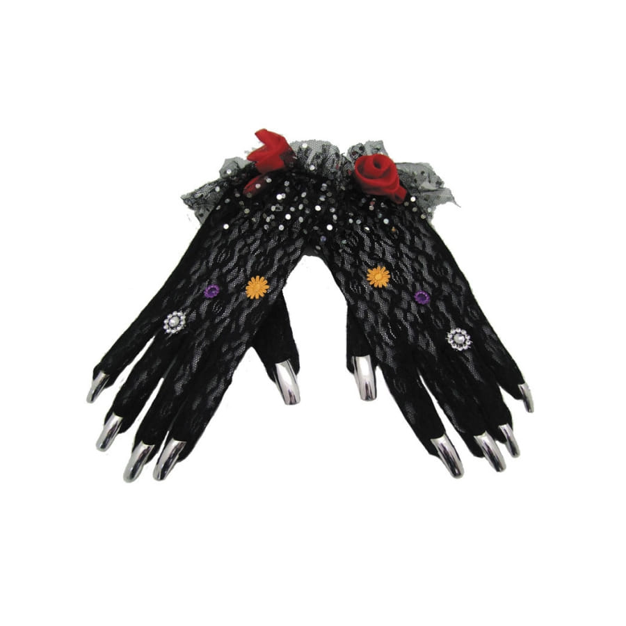 La paire de gants noirs Dia de los muertos ongles argentés pour femme est en dentelle.