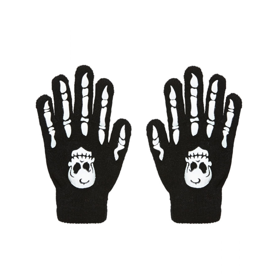 Ces gants noirs sont confectionnés dans un tissu épais présentant des imprimés blancs de phalanges et de crâne de squelette au dos de la main.
