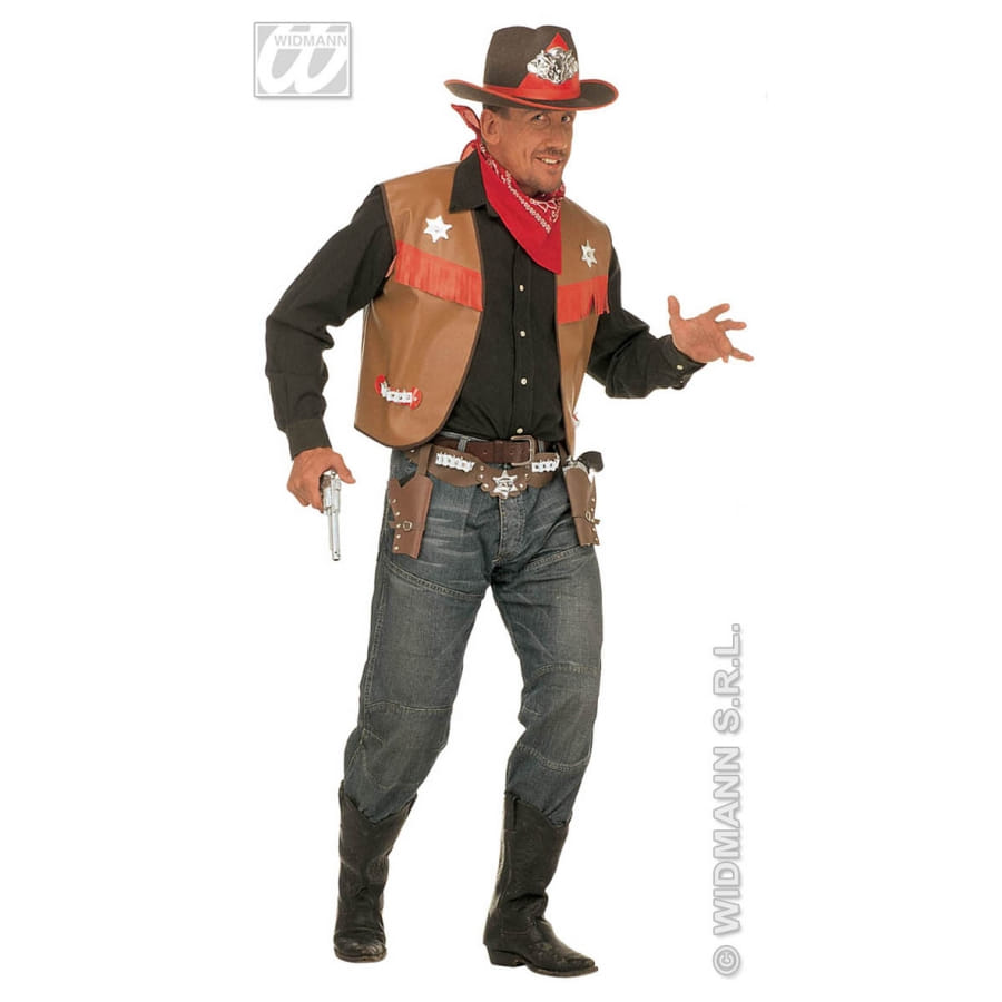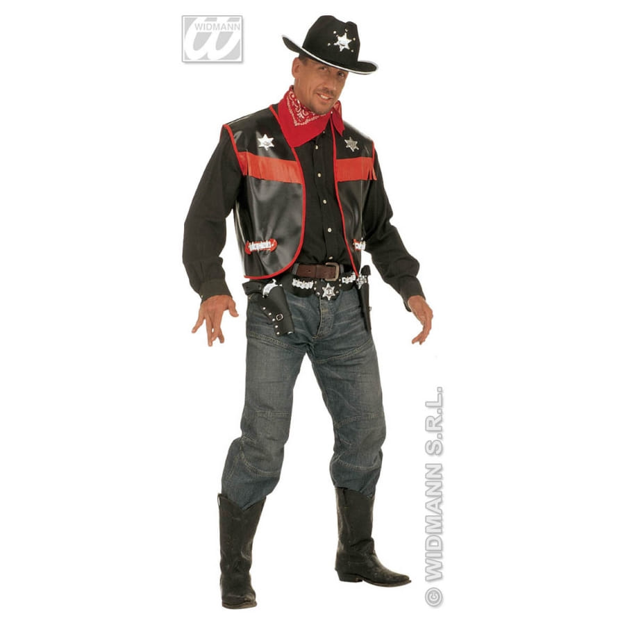 Gilet de cowboy avec bandes rouges et étoiles argentées. Cet accessoire est disponible en taille M, L ou XL. Au moment de passer la commande, vous ne pourrez choisir ni le modèle ni la couleur. Vous recevrez le modèle noir ou marron. Amusez-vous à vous faire passer pour un cowboy dur à cuir lors d'une soirée déguisée!
