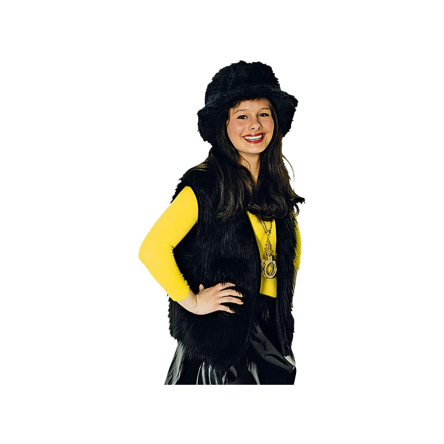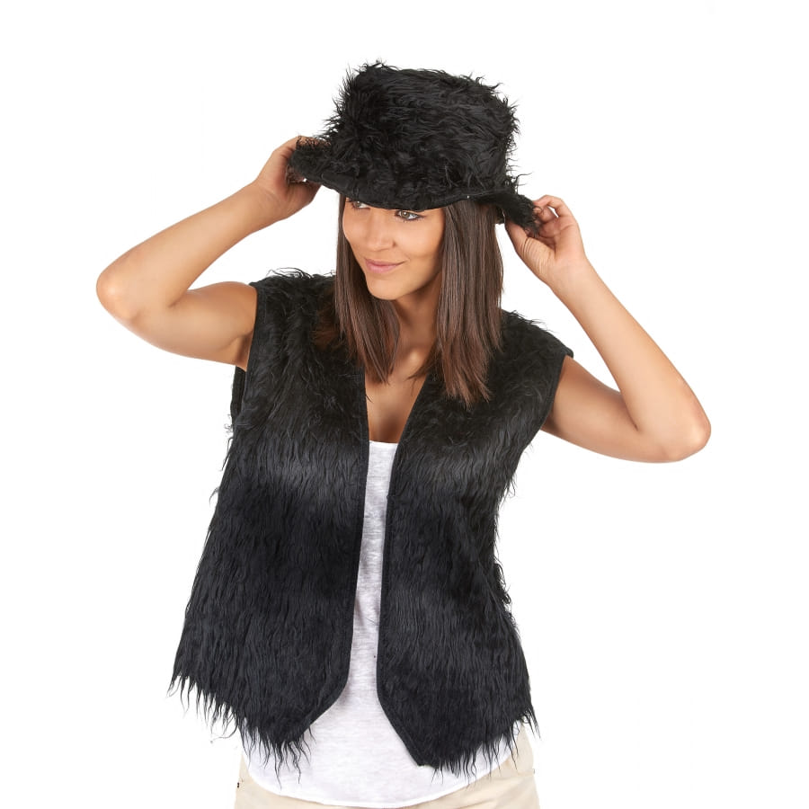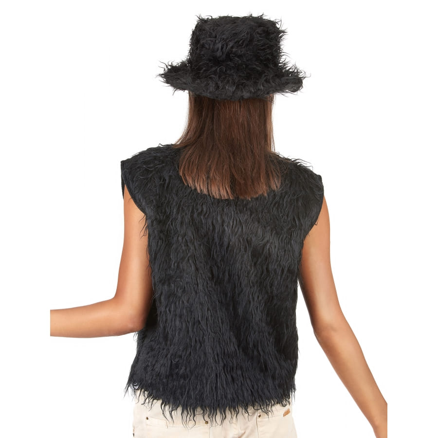 Gilet hippie en fourrure de couleur noire, pour femme. Le gilet de possède pas de fermeture à l'avant. Il ira très bien sur des vêtements flashy pour un look de berger ou de hippie moderne.