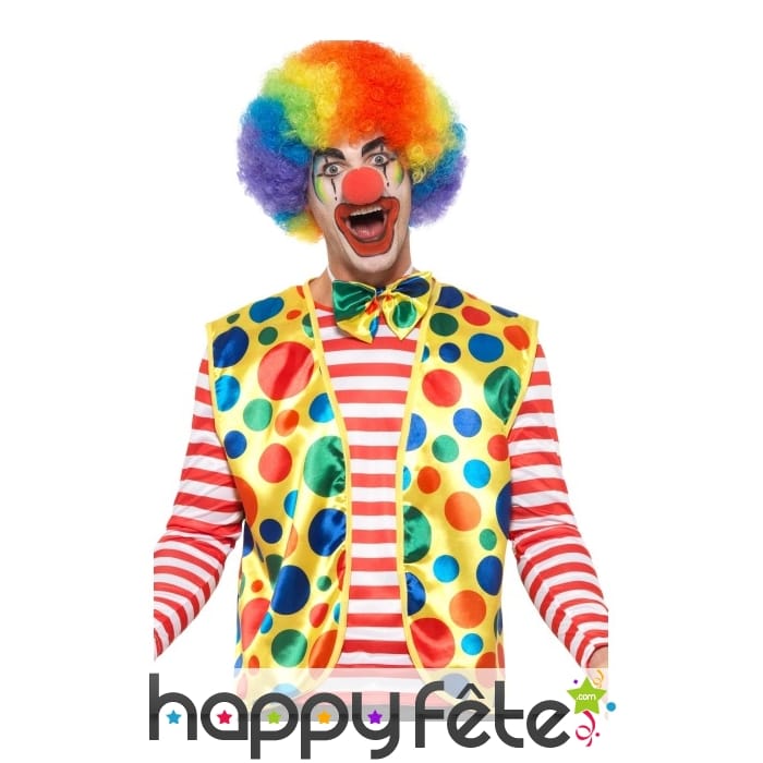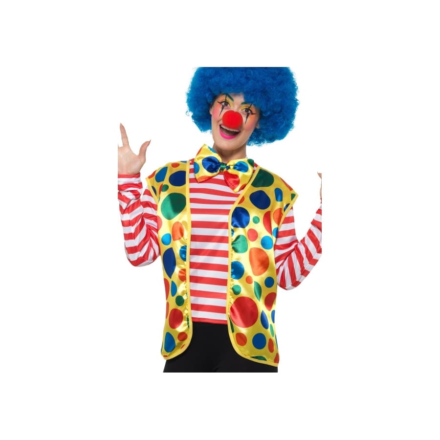 Les couleurs font la fête chez les clowns ! Si vous désirez obtenir un déguisement qui attire l'attention, emparez-vous de cet ensemble gilet et noeud papillon de clown à pois. Fabriqués dans un tissu satiné, l'ensemble affiche des motifs pois multicolores de différentes tailles, imprimés sur un fond jaune.