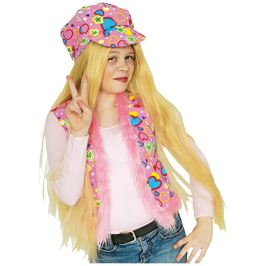 Elle incarne une hippie pourquoi ne pas lui faire revêtir ce magnifique gilet hippie de taille enfant. Elle pourra le porter pour le carnaval ou une fête sur les années 60. De couleur rose, le gilet a de la fourrure tout autour avec des cœurs multicolore dessus.