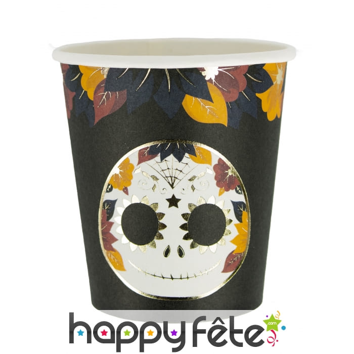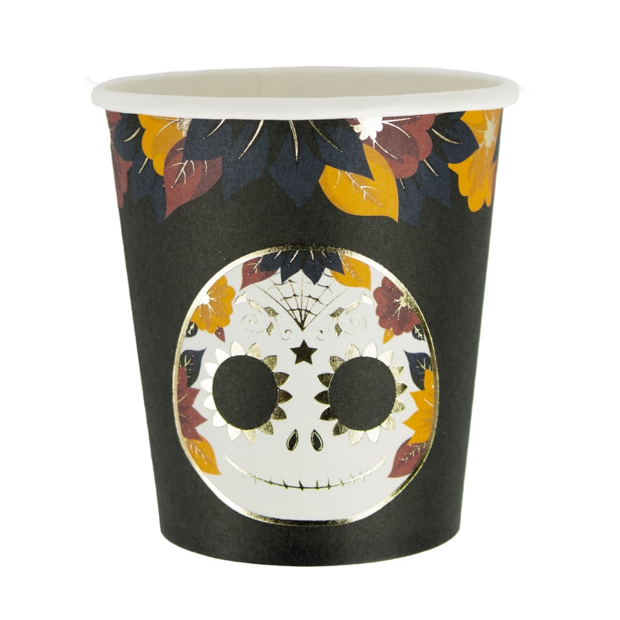 Célébrez Halloween avec le thème jour des morts mexicain (Dia De Los Muertos) avec cet ensemble de 8 gobelets en carton d'une contenance de 200ml chacun.