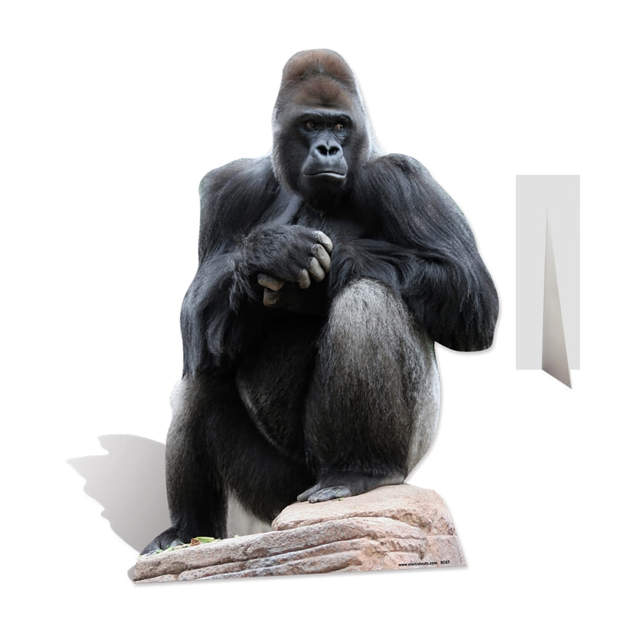 Procurez-vous ce gorille noir en carton plat taille réelle ! Il a une hauteur de 126 cm, représentant un grand gorille noir en train de s'asseoir sur une pierre. Ce sera une décoration fascinante pour une soirée sur le thème de la Jungle ou des animaux, ne serait-ce que pour prendre des photos avec !