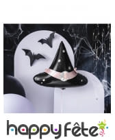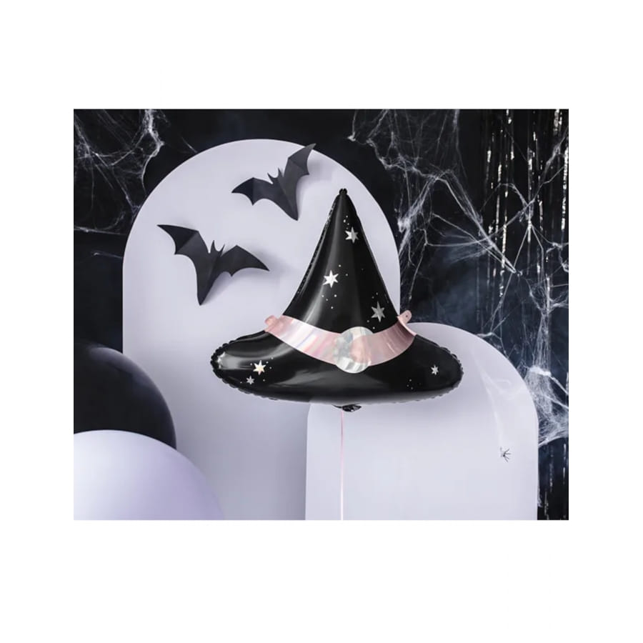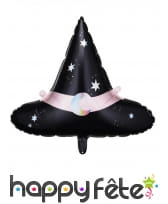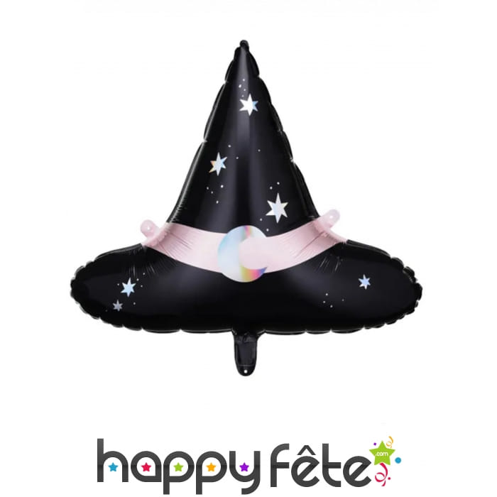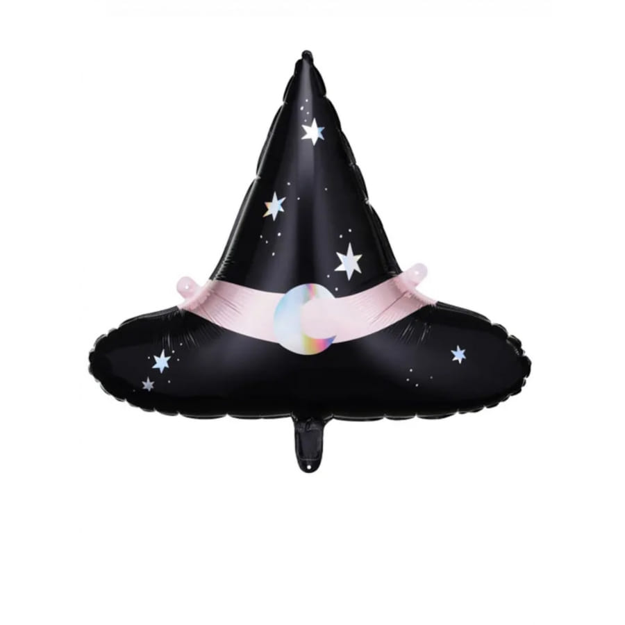 Ce ballon en forme de chapeau de sorcière conique mesure 66 x 57 cm et est confectionné à base d'aluminium. Gonflable à l'air ou à l'hélium, il est de couleur noire, avec une bande rose entre le cône et la base. Des détails blancs en forme d'étoiles sont également visibles et entourent une lune iridescente placée sur la zone rose.