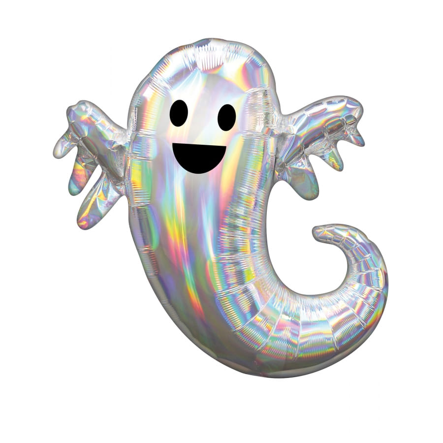 Cette décoration de 71 cm de haut présente la forme d'un grand fantôme iridescent avec des yeux noirs et un sourire de la même couleur.